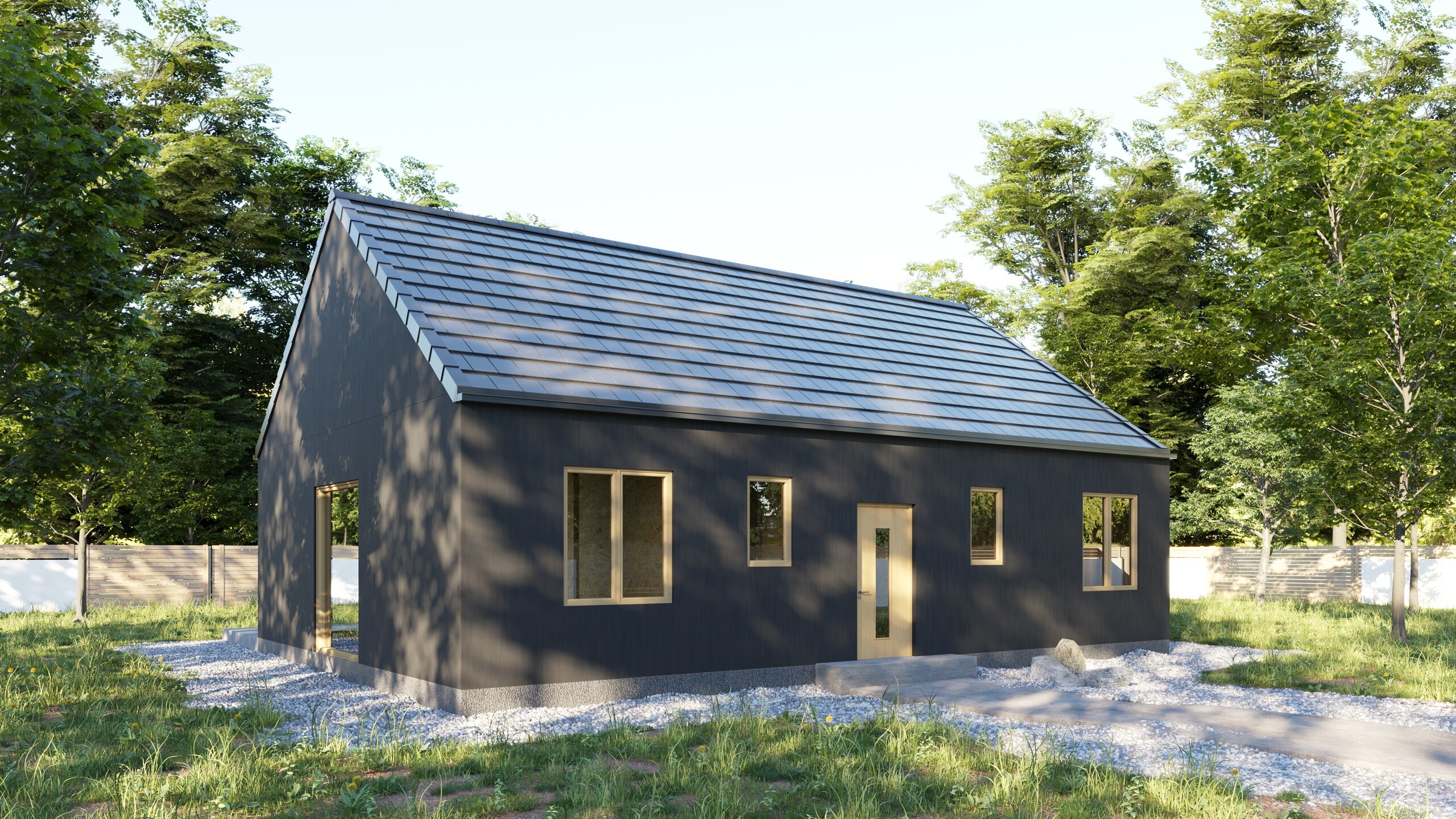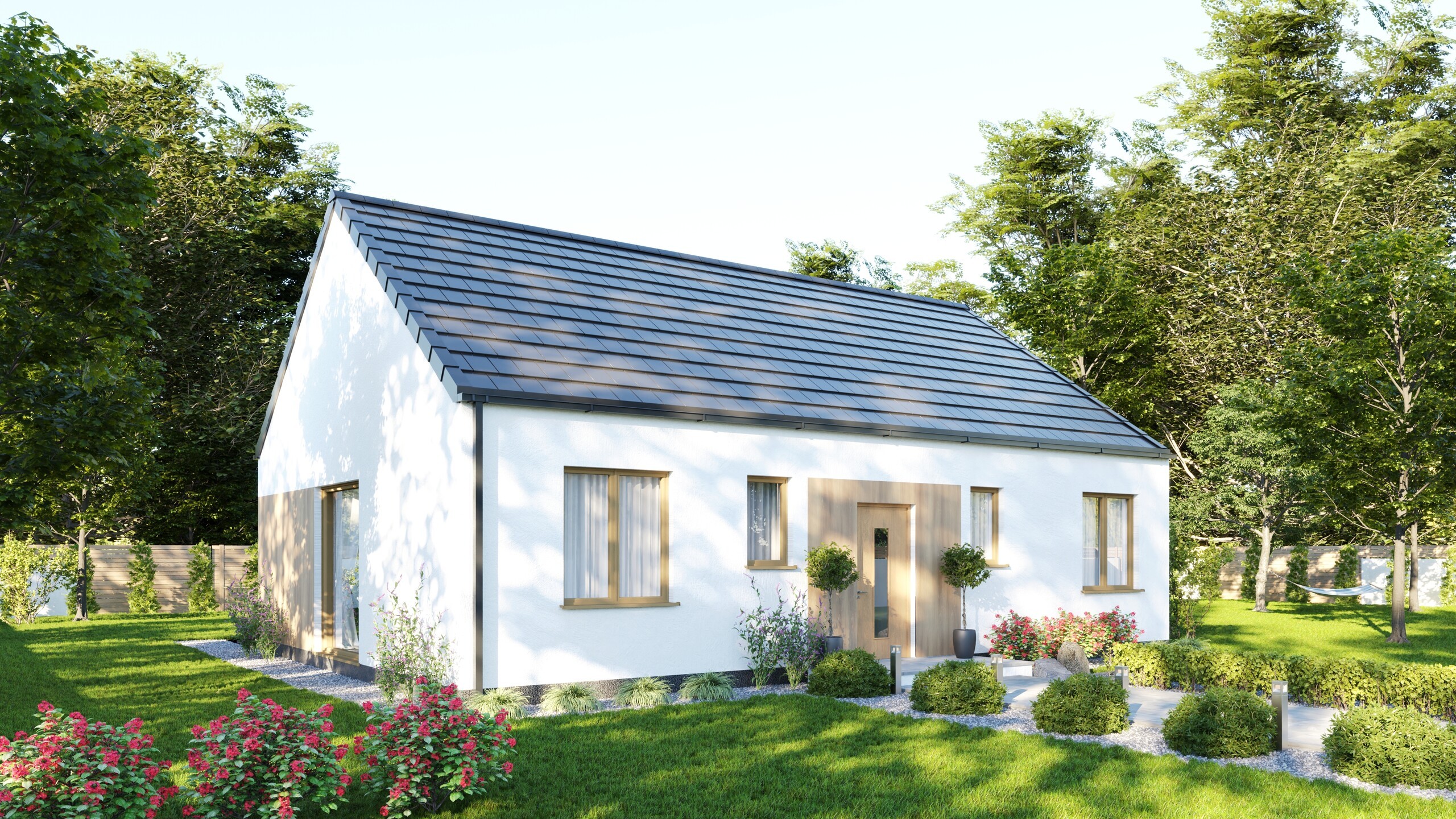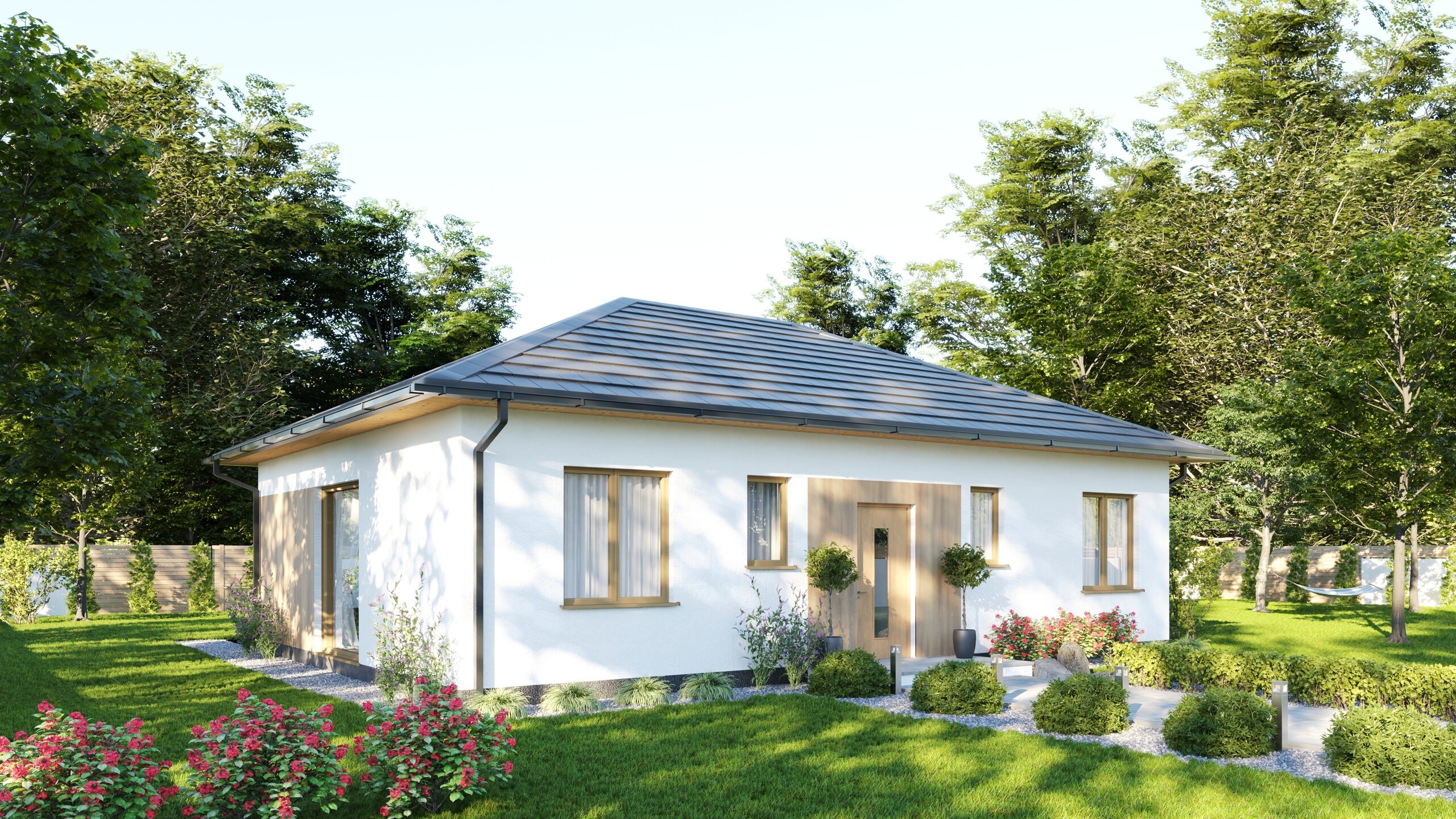 Poznaj Light Wood – nowoczesny, parterowy dom, który łączy funkcjonalność z przytulnym klimatem. Otwarta przestrzeń salonu, jadalni i kuchni tworzy serce domu pełne światła dzięki dużym przeszkleniom z wyjściem na taras. To idealne miejsce na rodzinne spotkania i relaks z widokiem na ogród.