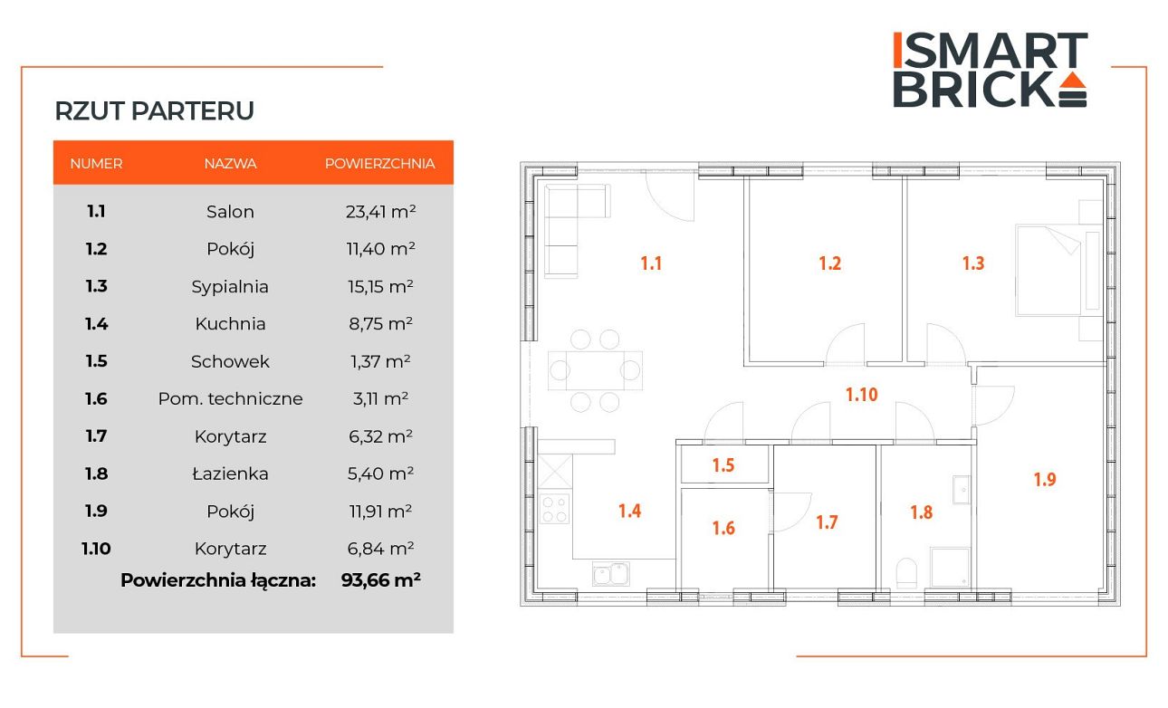 Projekt oferuje możliwość wyboru 2 lub 3 sypialnie, dzięki czemu łatwo dopasujesz układ do swoich potrzeb. Dodatkowo możesz zaplanować praktyczną spiżarnię. Całość mieści się na 94 m² i sprawdzi się doskonale dla 3–4 osób.